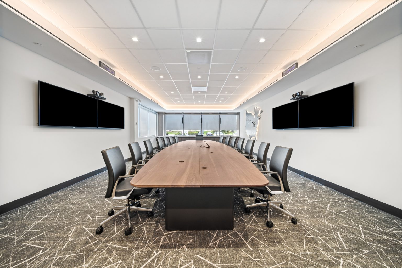 Advanced AV System: Dual high-definition video conferencing displays and ceiling-mounted microphones ensure crystal-clear communication and presentations.